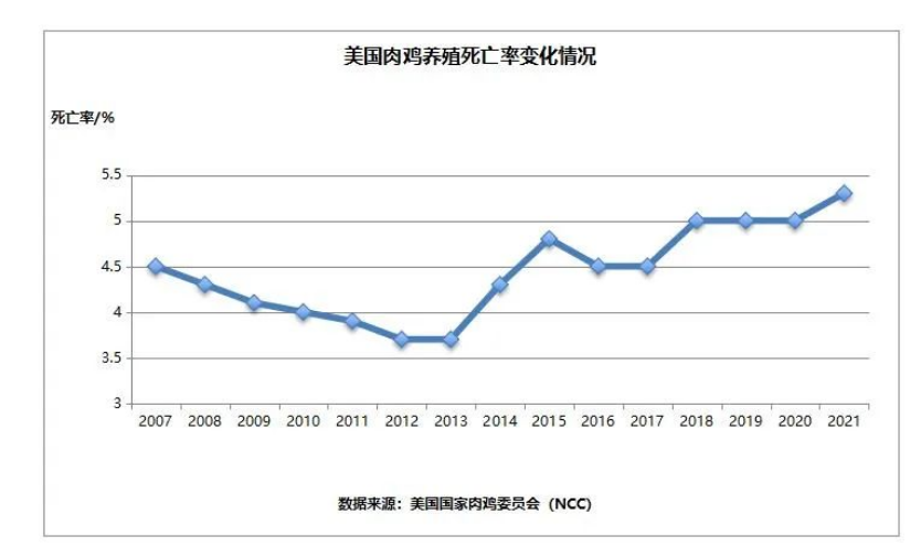 無(wú)抗生產(chǎn)導(dǎo)致家禽生產(chǎn)性能差、日增重降低、腸道疾病的風(fēng)險(xiǎn)增高、飲水少和高死亡率。2017年,美國(guó)的無(wú)抗No Antibiotics Ever, NAE)肉雞的月死亡率較傳統(tǒng)養(yǎng)殖高出25–50%。根據(jù)Agri Stats的數(shù)據(jù),從2017年10月到2018年5月,NAE肉雞的平均死亡率約為4.2%,而傳統(tǒng)養(yǎng)殖的平均死亡率約為2.9%。(https://doi.org/10.1111/nyas.14091)
