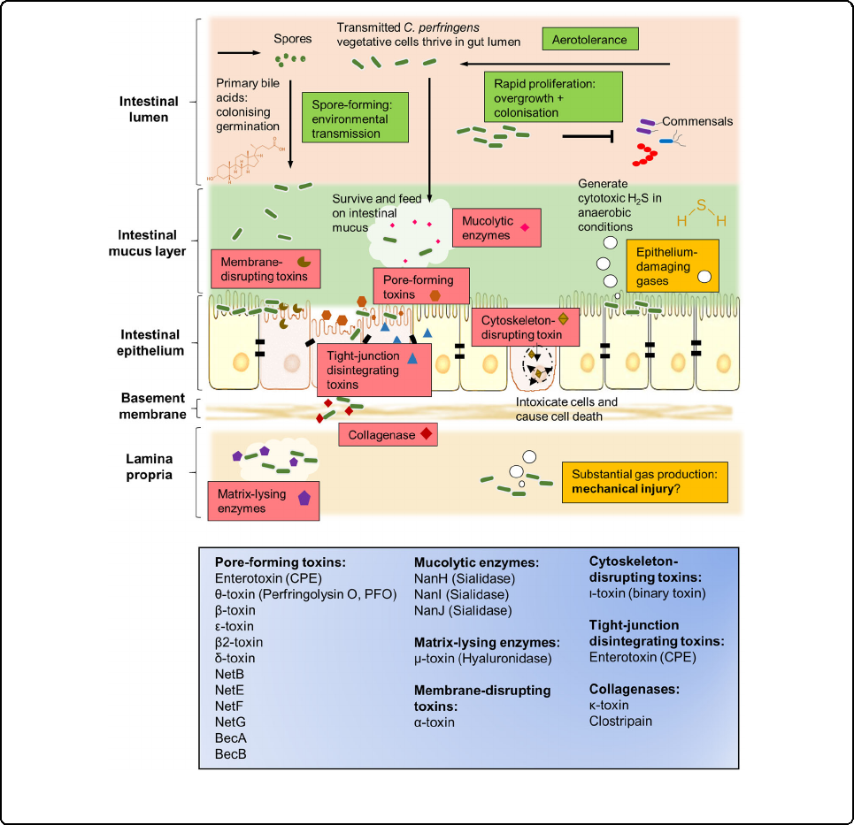 - 現(xiàn)已鑒定出的毒力因子超過20種(23種),根據(jù)其在腸道感染過程中的作用特點(diǎn),可分為成孔毒素、膜破壞毒素、細(xì)胞骨架破壞毒素、緊密連接破壞毒素、黏液水解酶、基質(zhì)溶解酶、膠原酶。這些毒素和酶類能夠單獨(dú)或協(xié)同作用,破壞宿主細(xì)胞和組織正常的生理結(jié)構(gòu)功能,危害動(dòng)物健康。