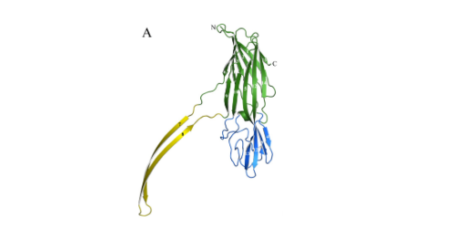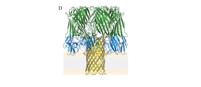 - NetB 單體約為0.18nm,包含3個(gè)主要結(jié)構(gòu)域,如圖示A:①β-sandwich:綠色,與單體寡聚化有關(guān);②stem:黃色,疏水跨膜結(jié)構(gòu),插入細(xì)胞膜;③rim:藍(lán)色,與細(xì)胞膜結(jié)合,參與毒素滲透進(jìn)入細(xì)胞膜;相較于其他β-PFT,缺失4個(gè)氨基酸,推測其在細(xì)胞膜上的受體與其他不同。