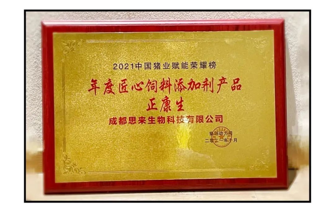 接著,會(huì)議第二項(xiàng)議程——“2021中國豬業(yè)賦能榮耀榜頒獎(jiǎng)典禮”召開。本次頒獎(jiǎng)典禮上,思來生物旗下產(chǎn)品——正康生®Plus榮獲“2021年度匠心飼料添加劑產(chǎn)品”獎(jiǎng)項(xiàng)。