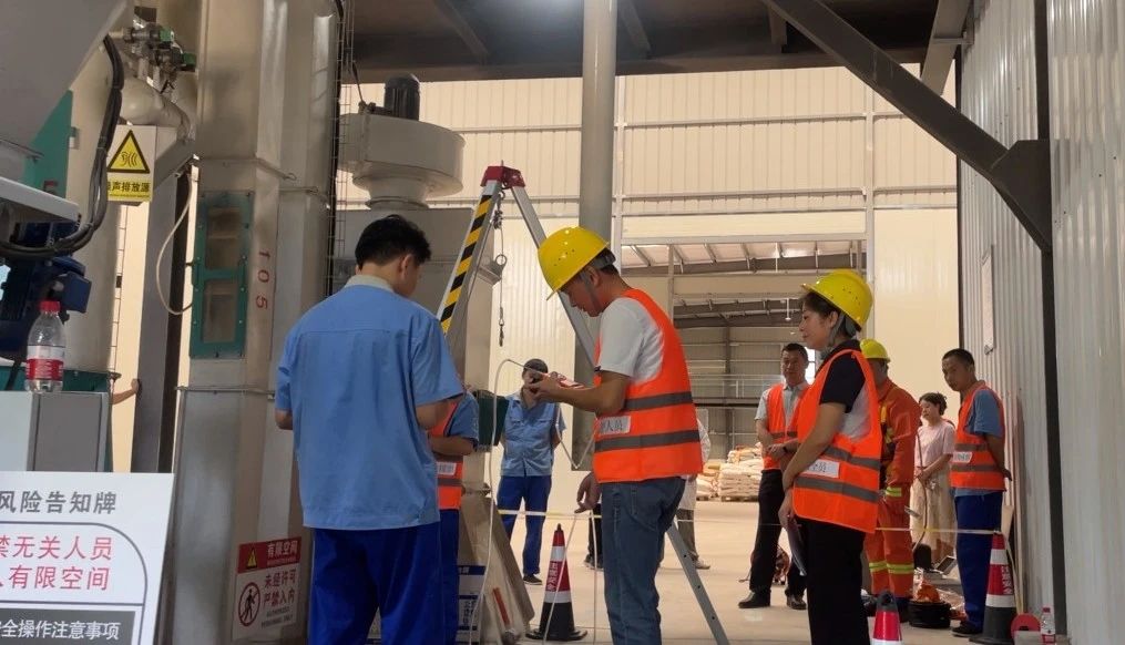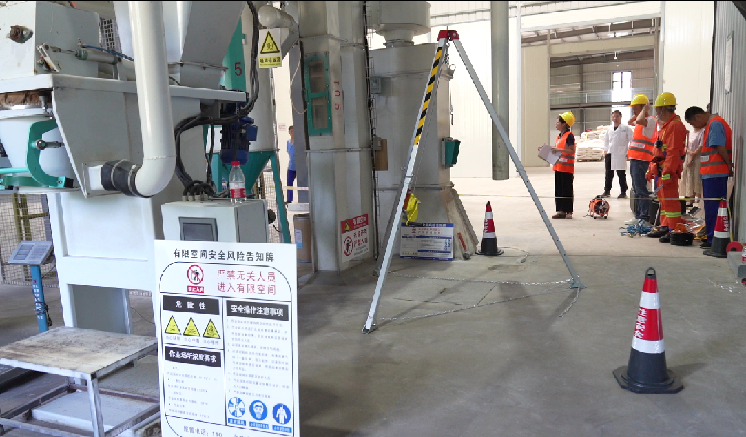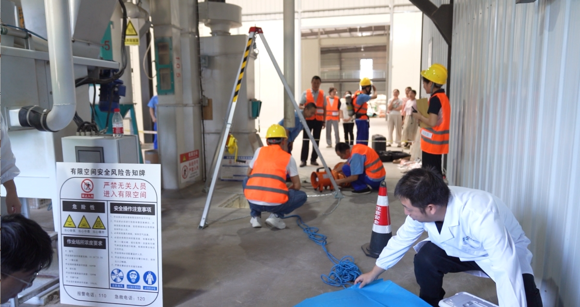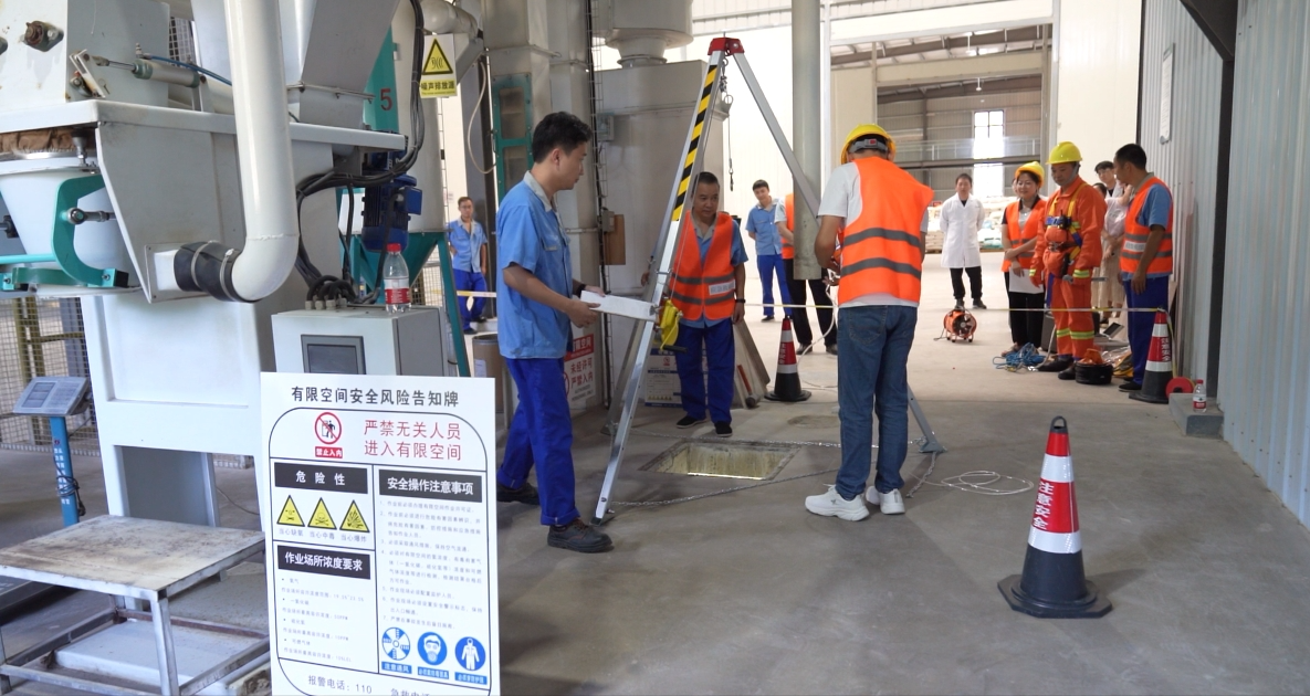 本次演練的有限空間位于混合型飼料添加劑生產(chǎn)車間的地下,現(xiàn)場作業(yè)組、檢測組、救援組、監(jiān)護組等參演人員,攜各類作業(yè)設(shè)備裝備按規(guī)范流程開展準(zhǔn)備工作。